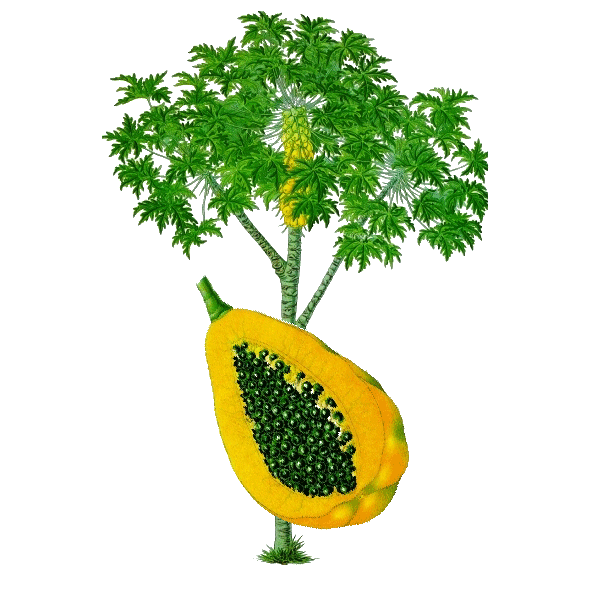 La Papaye : la Papaïne (enzyme contenue dans la papaye qui facilite la digestion des protéines, lipides, glucides, sucres...) contribue à faciliter l'élimination des amas et capitons graisseux et à favoriser la détoxination métabolique, elle est aussi une aide pour maintenir un bon équilibre acido-basique du système digestif et son action anti-oxydante est aujourd'hui très appréciée (stimulant de la production d'enzymes antiradicalaires)..